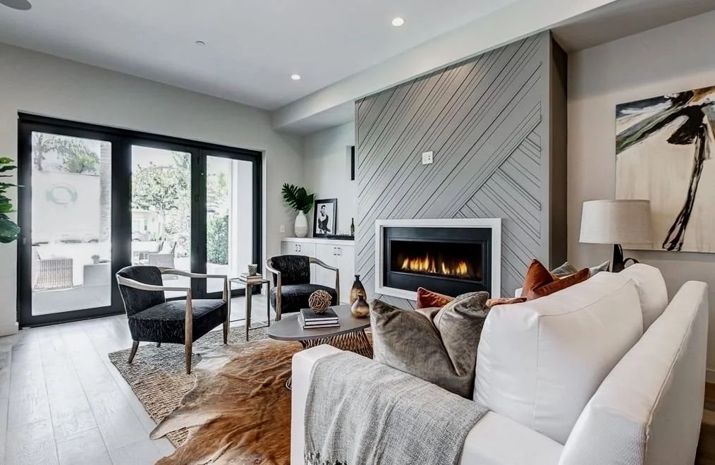 • Beautifully curated living room interior featuring custom furnishings, layered textures, and personalized color palette, reflecting luxury interior design in Pacific Palisades, Malibu, or elsewhere in Southern California.